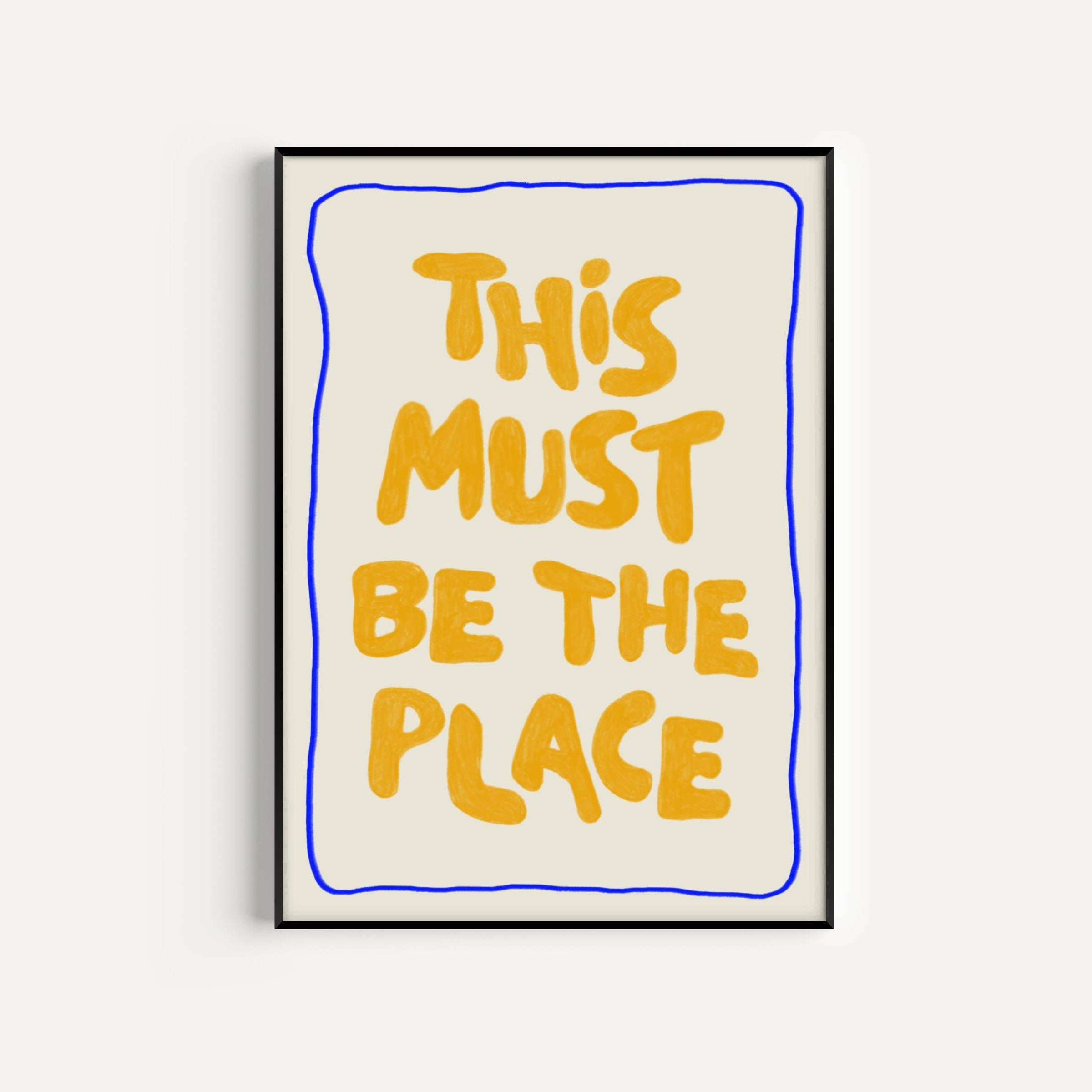 This is a bold typography print, saying “This must be the place”. The font is in handwritten pencil style in yellow, over a cream background, with a blue border.