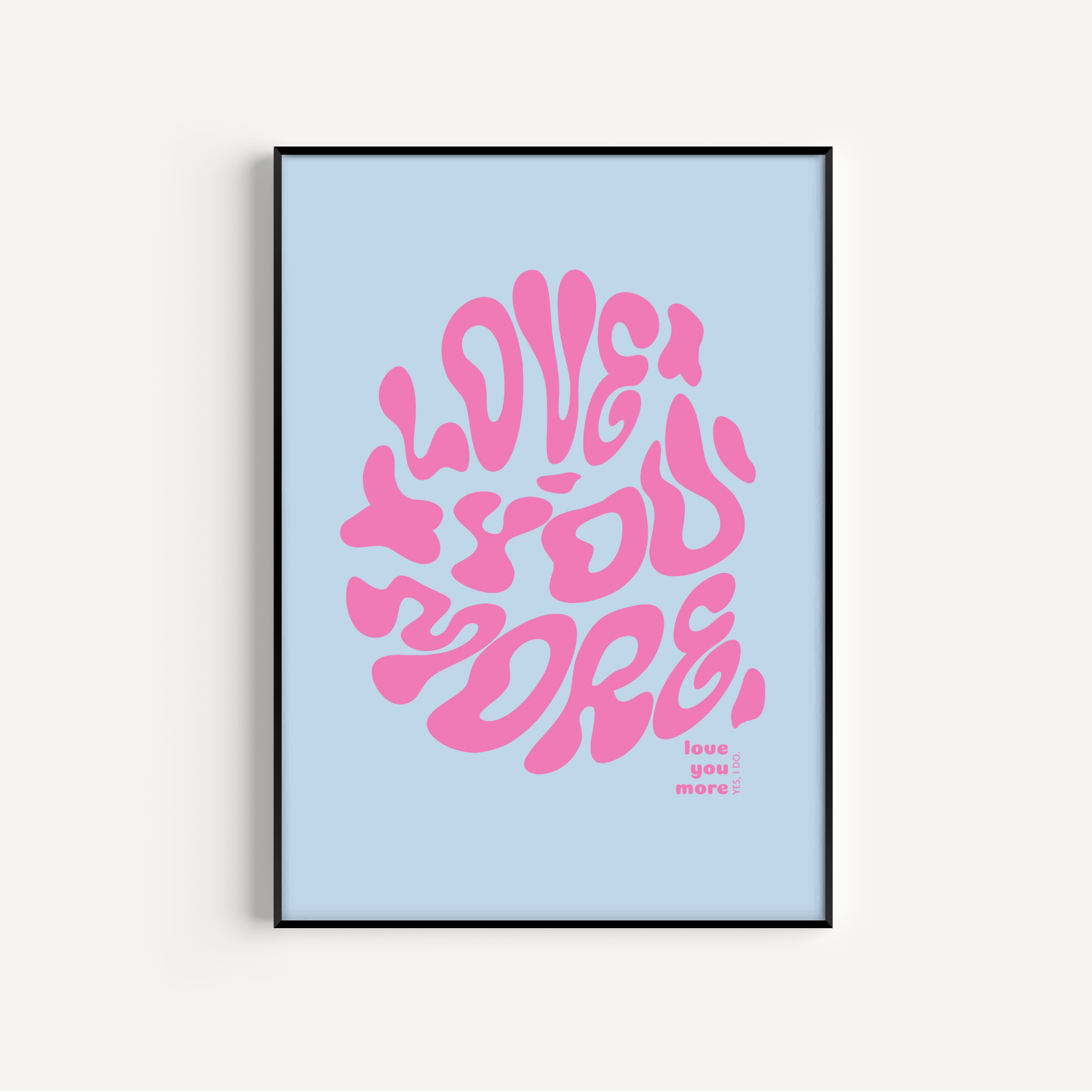 This is an abstract print saying “Love You More” with wavy letters in a wobbly typeface. This design comes in nine colourways. Simply select your colour from the following options;