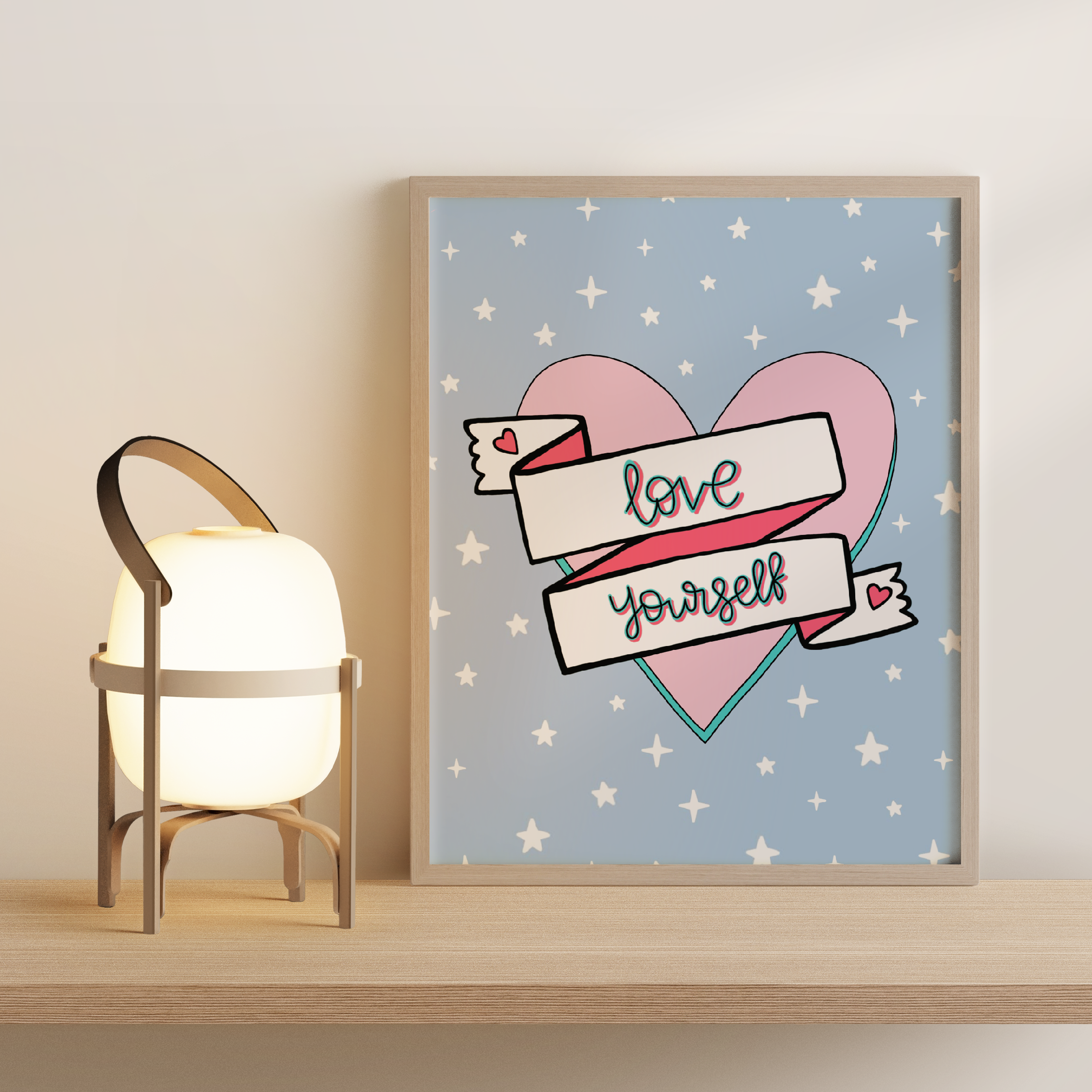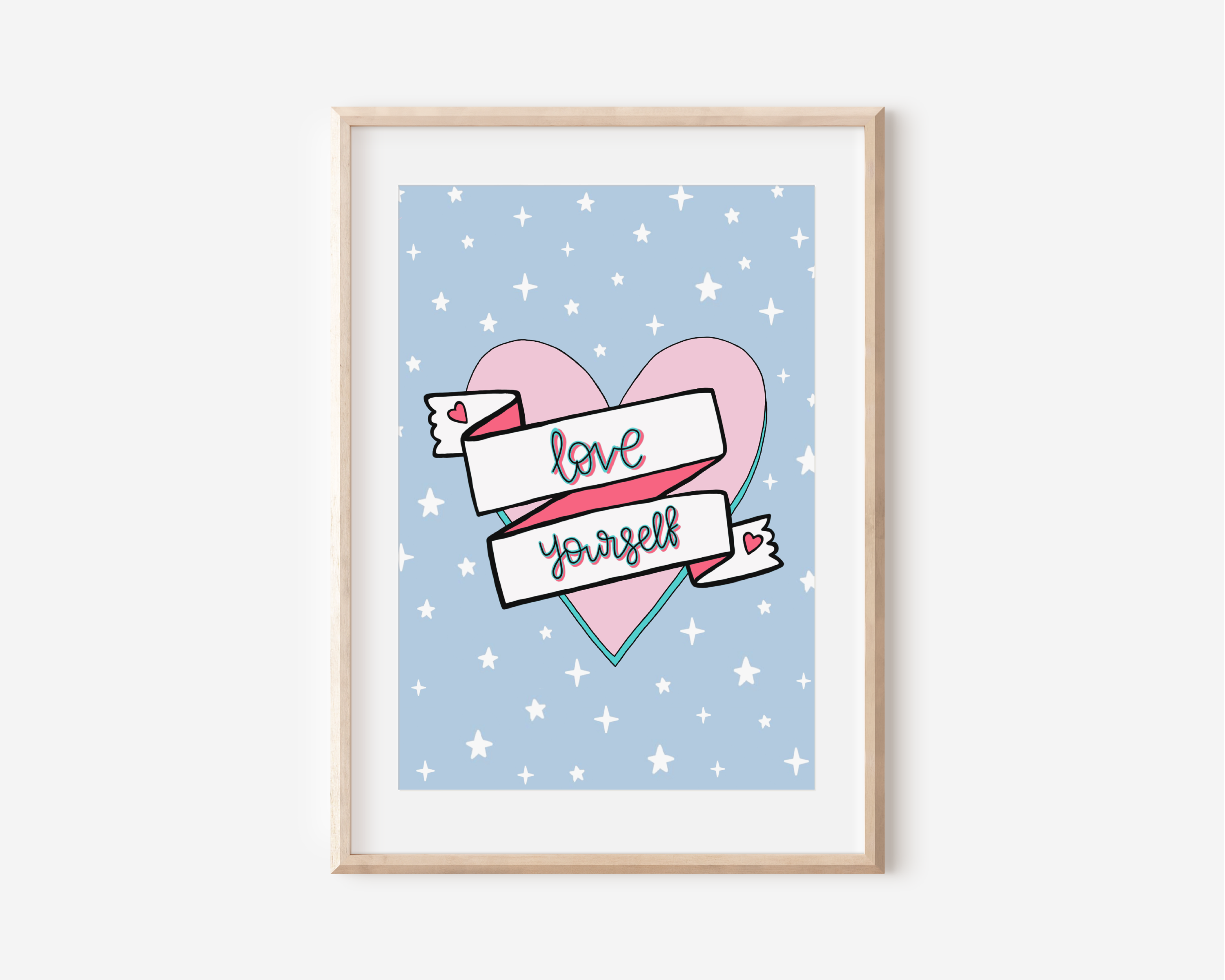 This is a print saying “Love Yourself”. It is written in pink and teal writing, on a white scroll banner. The banner is over a pink heart. The background is light blue with white stars. The perfect print for your home to remind you how fab you are, to kick that self doubt to the kerb and love yourself for exactly who you are!