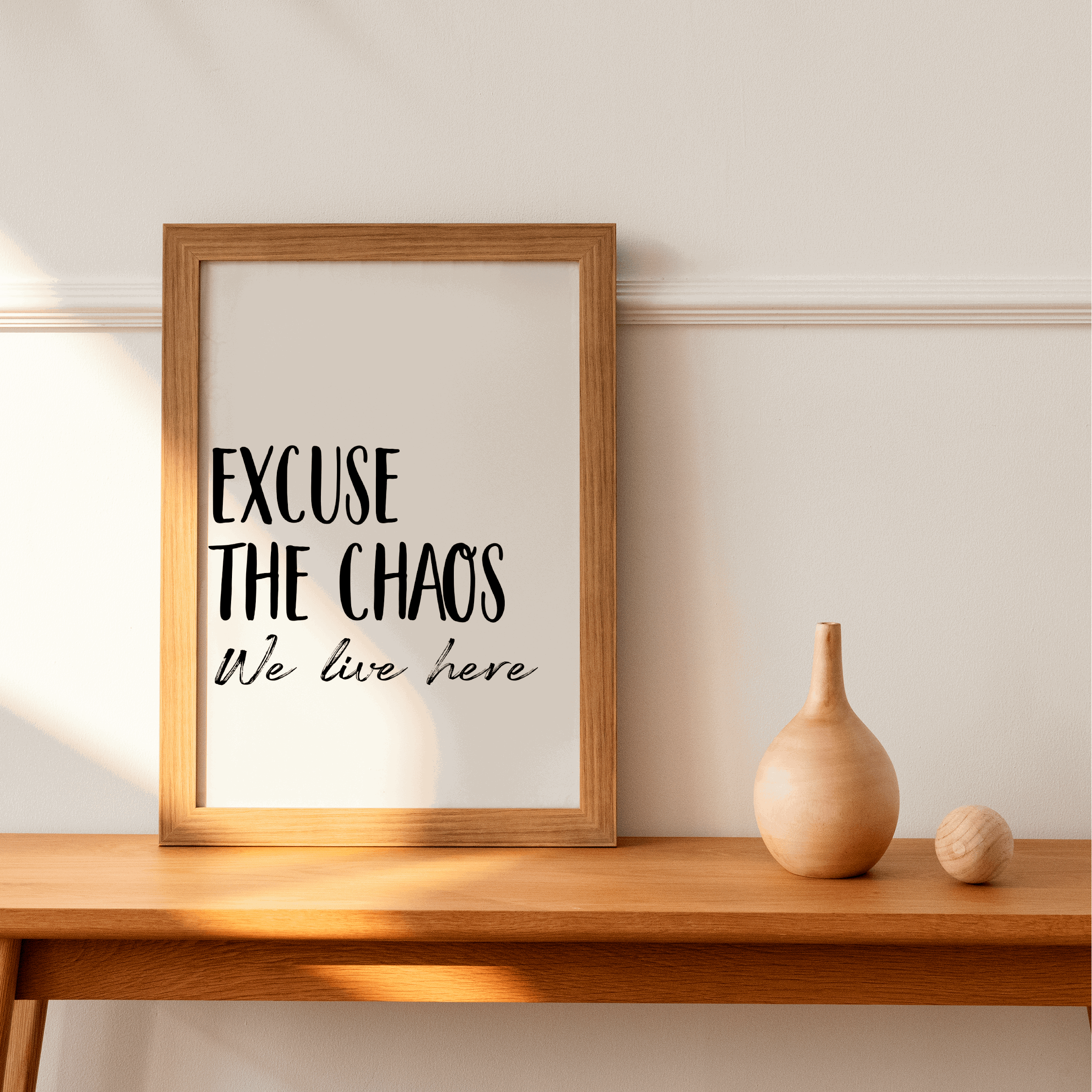 This is a print saying "Excuse the Chaos, we live here" in a hand written modern calligraphy. This is a monochrome print, the text is in black, on a white background.