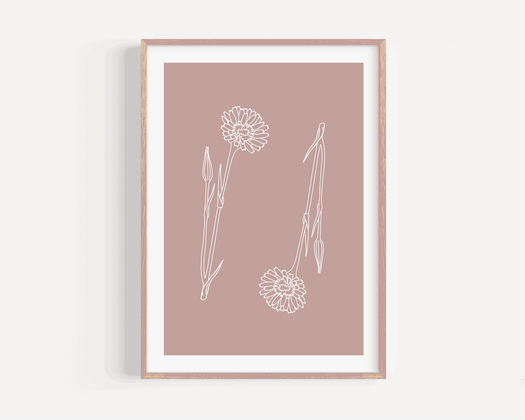 This print is part of my botanical range. Featuring hand drawn wildflowers in white, on a range of pink toned backgrounds, with a white border.