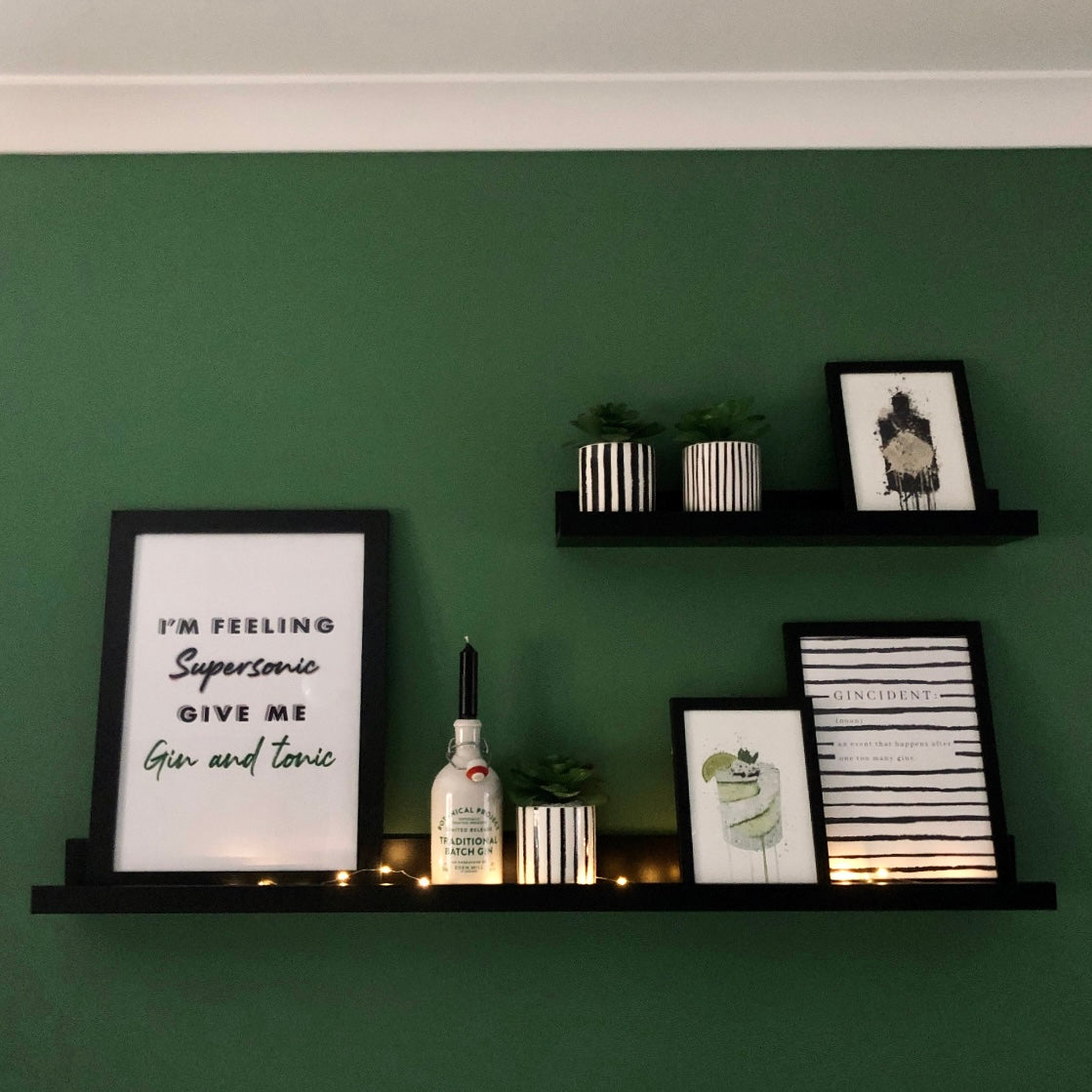 A modern typography print, featuring the lyrics “I‘m feeling supersonic, give me gin and tonic” lyrics from, Supersonic by Oasis. The font is in black, “supersonic” is written in a digital effect and “Gin and tonic” is written in green calligraphy.
